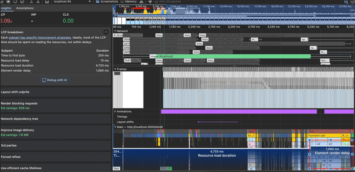 그 이후에도 추가 개선할 수 있는 방법을 찾기 위해 퍼포먼스탭을 살펴 보았는데 FCP와 LCP에서 문제점을 찾을 수 있었다.